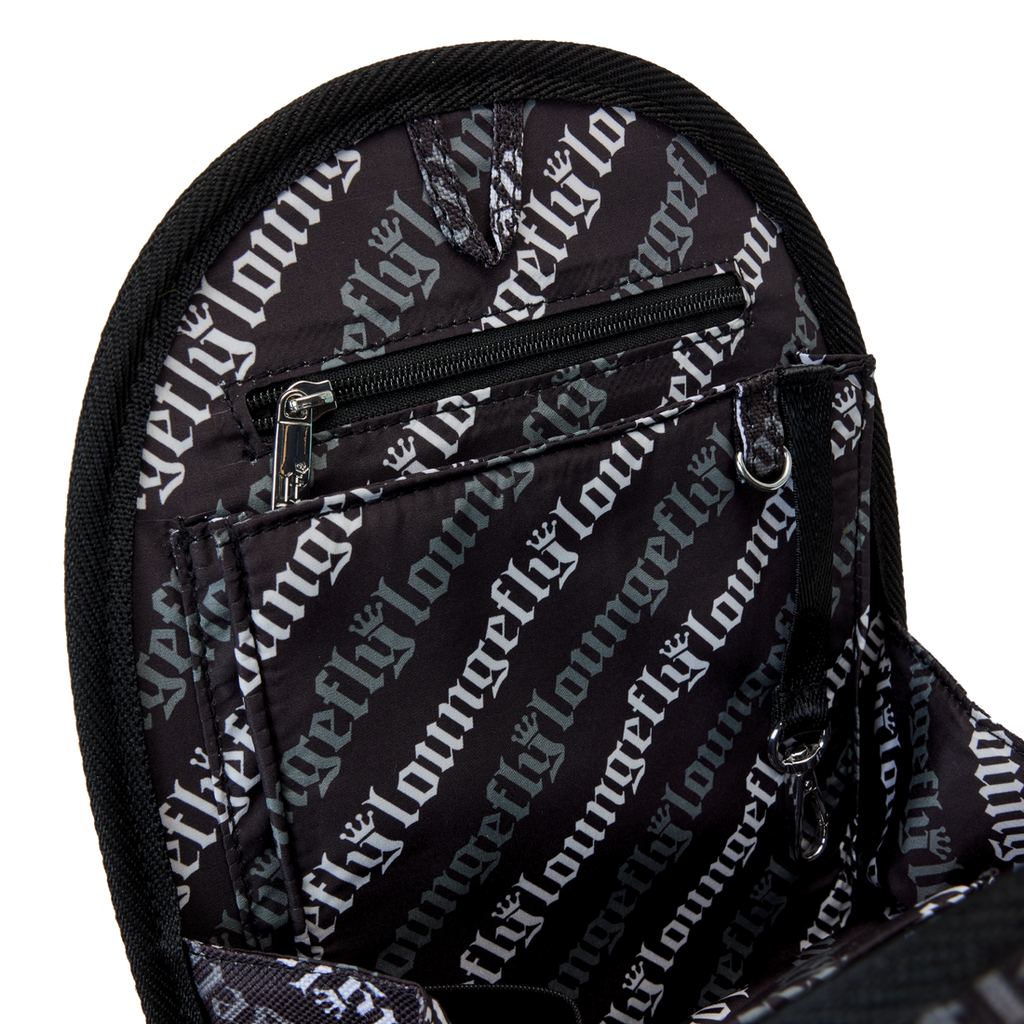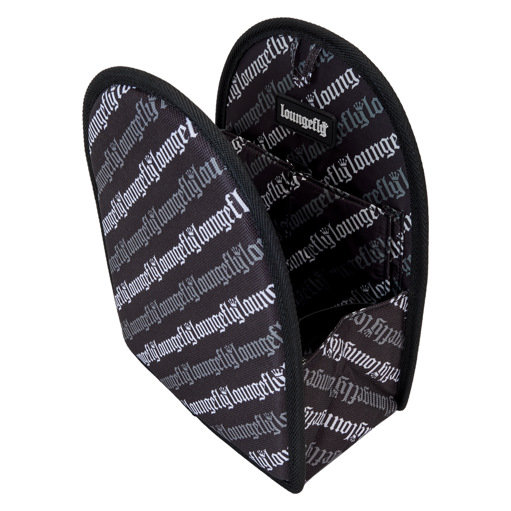 The Loungefly Mini Backpack Insert Organiser is made of nylon and features collapsible patch pockets, drop pockets, utility loops, lobster clips, D-rings, and printed details.